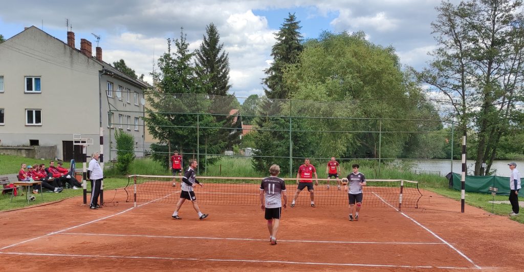 Průběžný stav ve skupině A před tímto duelem hovořil jasně, domácím k potvrzení vítězství v základní části stačil bod, hosté, pokud by chtěli ještě domácí teoreticky předstihnout, potřebovali zvítězit. Situaci jim ale neusnadnilo to, že dorazili na jih bez své opory Klabíka a museli překopat své sestavy. Utkání se odehrálo za slunečného počasí, ale jeho kvalitu dlouho ovlivňoval silný vítr. V úvodním zápase dvojic nastoupil domácí pár Votava s Tomanem, proti J. Landrichterovi s Holatou. Hosté dokázali získat úvodní set, domácím se však podařilo utkání otočit a získat první domácí bod. Ke smůle domácích jejich elitní dvojice Hokr, Slavíček proti Padělkovi s Jirouškem letos poprvé prohrála a bylo vyrovnáno na 1:1. Pravá nohejbalová řežba pokračovala i v úvodních zápasech trojic. Nejprve Votava s Tomanem a Švancarem po boji přelačili ve třetím setu Jirouška s bratry Landrichtery a získali domácím opět vedení. Poté Slavíček s Hokrem, Vachulkou a střídajícím Nepodalem získali snadno první set proti Holatovi, Foktovi a Padělkovi a v dobrém výkonu pokračovali i v setu druhém, až do vedení 7:4. Pak ale domácí udělali několik chyb, vrátili hosty do zápasu a ti šanci využili a získali set 10:9. O osudu zápasu musel rozhodnout třetí set, a znovu poslední možný míč, když se Padělkovi povedlo šikovně vytlouct Nepodala na bloku, bylo opět vyrovnáno. Ve vložené dvojici nastoupil Havlík s Vachulkou proti Foktovi a T. Landrichterovi, domácí borci předvedli bezduchý výkon a asi nejhorší v sezoně. Hosté si s nimi doslova pohrávali, nepomohlo ani střídání a nasazení Pacovského a hosté se dostali poprvé do vedení. Pěkný nohejbal byl k vidění v zápase singlistů, ke kterému nastoupili Hokr proti Holatovi. V utkání zvítězil domácí borec, když udělal v utkání méně nevynucených chyb, což se ukázalo jako rozhodující. Po úvodní odvetné trojici se domácí dostali znovu do vedení, když Votavova trojice porazila tu Padělkovu až posledním možným míčem ve třetím setu. Hosté pak opět kontrovali po vítězství Jirouškovi trojice nad Nepodalovo, jak jinak než po třech setech. Vyrovnáno 4:4 a o výsledku musí rozhodnout odvetné dvojice. Nejprve Votava s Tomanem nestačí ve třech setech na Jirouška s Padělkem, aby v zápětí Slavíček s Hokrem udolali Holatu s J. Landrichterem také ve třech setech a určili tak konečný stav 5:5.