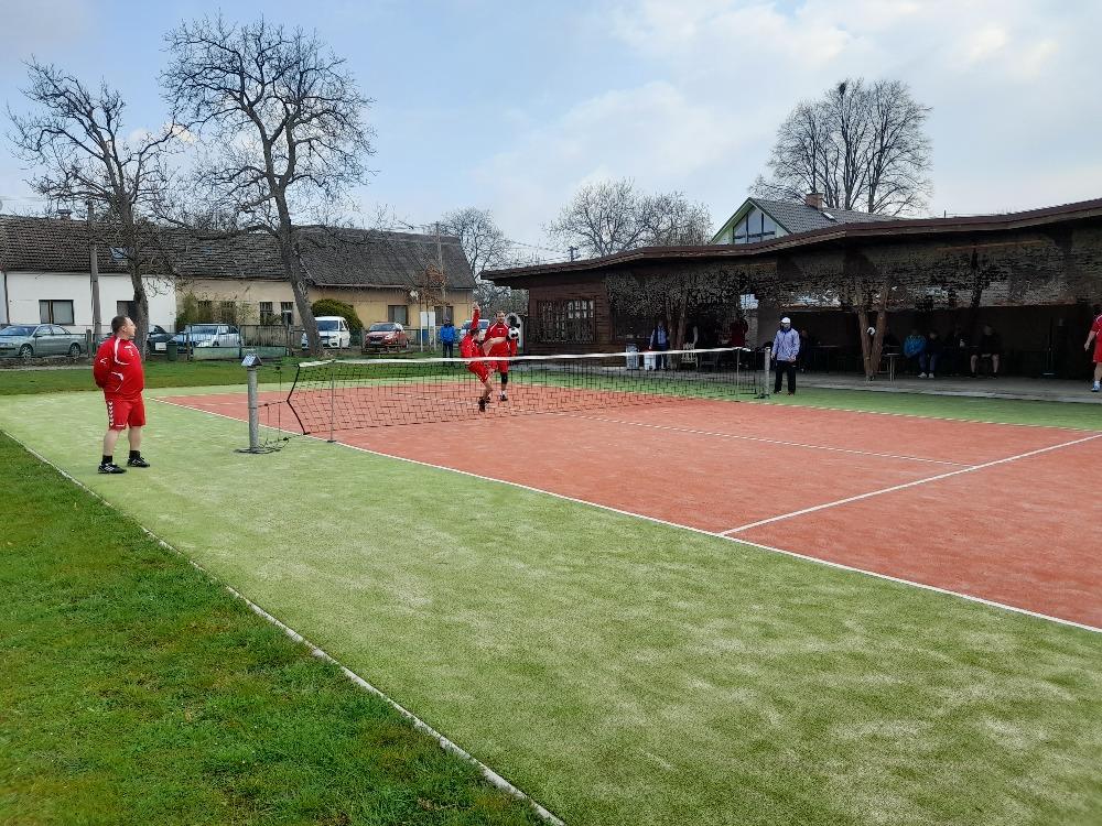 Hostům se na Velký pátek zřejmě moc hrát nechtělo, protože dorazili v šesti. Domácí měli k dispozici 11 hráčů a bylo to znát. Konečně se mohlo hrát na venkovním hřišti a bylo vidět, že oba týmy nemají antuku moc zažitou. V prvním zápase Toman s Votavou doslova smetli dvojici hostujících dorostenců Hadače se Šebestou, kterým dovolili uhrát pouze tři míče. Na jejich výkon následně navázali Slavíček s Hokrem, kteří také ve dvou setech porazili Beránka s Barešem. Rozjetí domácí pak dokázali potvrdit převahu i ve hře trojic, když nejprve Toman s Votavou a Havlíkem přehráli Bergmana, Šebestu a Hadače 2:0 a v dalším zápase Vachulka, Slavíček a Hokr přehráli Beránka, Bareše a D. Vobra také 2:0 i když ve druhém setu hosté vedli už 9:5. Do zápasu třetích dvojic nastoupil rekonvalescent Nepodal a společně s Pacovským a střídajícím Křížem nedali Bergmanovi s D. Vobrem šanci. Havlík neměl proti Beránkovi prakticky šanci, a tak hosté zahnali hrozícího „kanára“. Hosté zvedli hlavu a trojice Beránek, Bareš a Vobr získala první set. Domácí však krátká dešťová přeháňka probrala a vcelku v pohodě dotáhli utkání po necelých třech hodinách do vítězného konce.