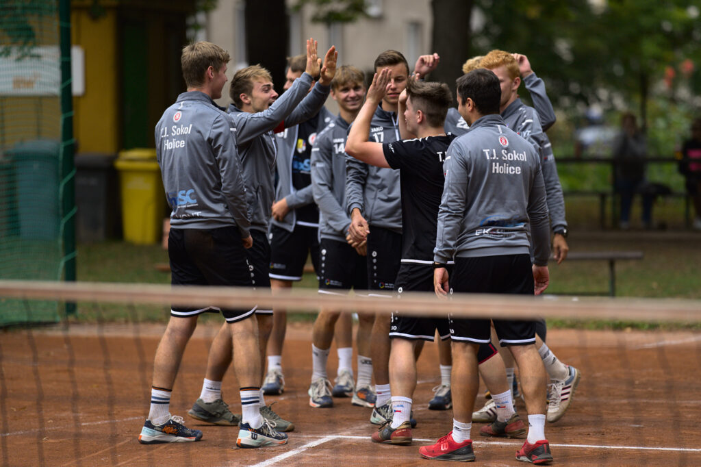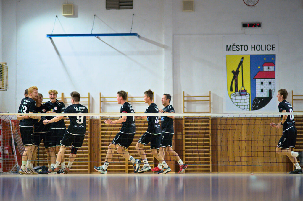 Druhá otočená trojice Fries, Nastoupil, Čižínský – Klabík, Holata, Fokt. První set vyrovnaný do 5:5, domácí výbornou hrou v poli i na útoku utekli na 9:5 a set dohráli 10:6. Druhý set boj o každý míč do 9:9. Za tohoto stavu se podařilo Friesovi vytlouct hostující blok a Holice byli ve finále 2. ligy.