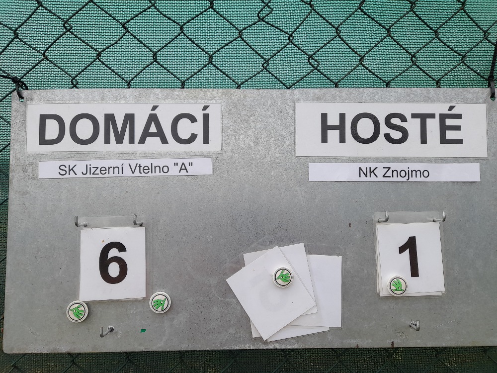 Umělý koberec přivítal v Jizerním Vtelnu dalšího nováčka soutěže, tým Znojma. Od začátku měli domácí herně navrch a po úvodním deblu, kde Sekera s M. Kašpárkem přemohli Kolštroma s A. Vlčkem se zdálo, že bude brzy hotovo. Jenže dvojková jistota hostů Jonas a Kuřitka po ovládnutí druhého setu přidala i dobře zvládnutou koncovku rozhodujícího dějství. Nerozhodný stav ale nevydržel dlouho a Sekera s oběma Kašpárky vyučil Jonasovu trojku s Muchou a Kuřitkou. Ani ve druhých trojicích nedokázali hosté z jihu Moravy domácím Sucharovi, Červinkovi a Šťastnému vzdorovat a Kolštrom s oběma Vlčky získali pouhých osm bodů. O. Kašpárek s Červinkou nedali Muchovi, Karáskovi a střídajícímu J. Vlčkovi žádný prostor k překvapení, a když Sekera v kvalitním singlu předčil Kuřitku, měli domácí mečbol. Ekipa M. Kašpárka však nezvládla koncovku úvodní sady a musela proti Kolštromovi a spol. odvracet v druhém dějství porážku. Třetí set však už měli domácí pod kontrolou a koncovku zvládli s přehledem.