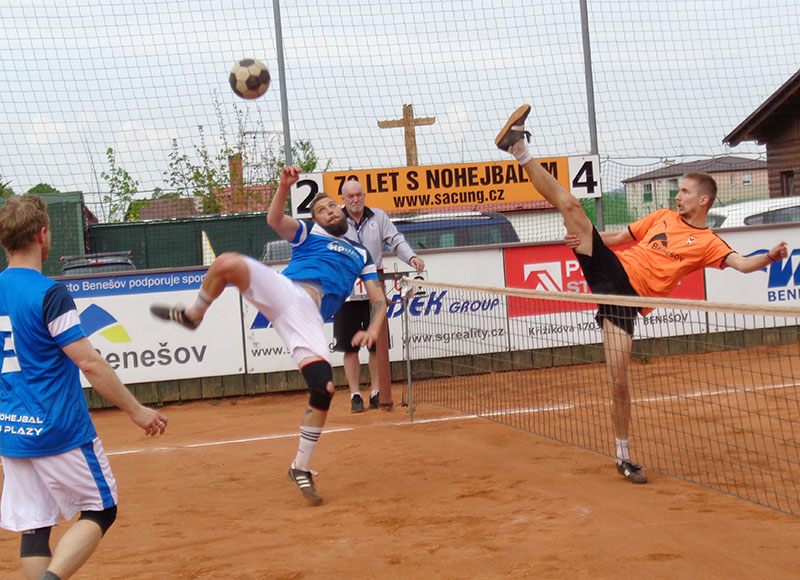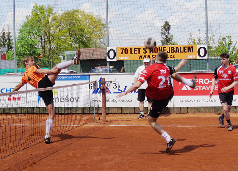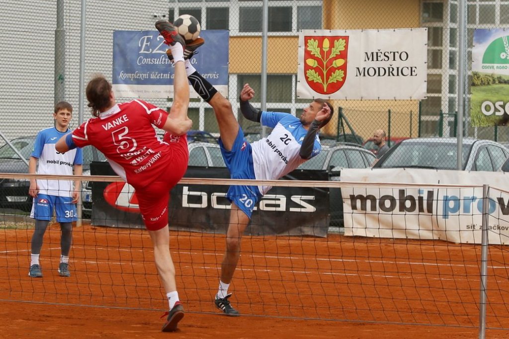 Tahákem kola byl jednoznačně souboj dvou zatím neporažených týmů z čela tabulky. A ani tento zápas na tom nic nezměnil. Z bitvy až do posledního setu vítěz nevzešel. Hosté využili zranění v domácích řadách a před zraky cca 120 diváků z modřického areálu jeden bod uloupili. Oním zraněným byl pilíř modřické sestavy a dvorní nahrávač kapitána Pospíšila, Lukáš Rosenberk, který si pochroumal kotník na doplňkovém sportu a přišel své spoluhráče podpořit alespoň do diváckých řad. Úvodní debly přinesly dělbu bodů, když za Západočechy srovnával proti Kopovi s Višvaderem ve třetím setu Vanke a Putík. Kop Hokrovu trojici naprosto zničil a poté Pospíšilova trojice dokázala po střídání a debaklu v prvním setu zpřesnit hru na náhře a zkušený kapitán modřických proti Vankemu zápas otočil. Střední pasáž utkání skončila smírem a tak byl před odvetnými trojkami stav utkání 4:2. Vankeho trojice proti Kopově svůj part zvládla, když domácího bombarďáka po Vankeho chyceném útoku zradila při příliš precizně zahraném kraťasu síť. Pospíšil se s druhou trojkou hostí vůbec nezdržoval a do odvetných dvojic šli domácí s jistotou zápasového bodu a dvoubodovým náskokem 5:3. Jenže v závěrečných třísetových bitvách si vedli lépe Západočeši a vydolovali tak na jihomoravské půdě alespoň bod za remízu. Především střídání v poslední dvojice dne vyšlo stejně dobře, jako tomu bylo před týdnem v zápase proti Čakovicím. Hokra po prvním prohraném setu vedle Tolara vystřídal Kokštein a všem ukázal, jak se hraje účinný dvojkový nohejbal.