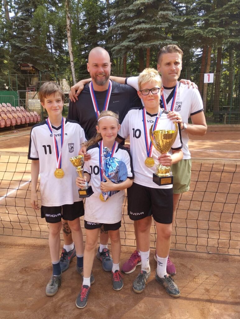 Hodnocení trenéra vítězné trojice Milana Kaděry (Dolní Počernice): ,,V posledním pohárovém turnaji dvojic, který jsme shodou okolností pořádali, jsme měli sestavy na 1. a 3. místě. Trochu jsme tedy počítali, že ve dvojicích bychom mohli umístění opakovat. To se bohužel nepovedlo a posledním míčem ve třetím setu jsme skončili čtvrtí, zklamání kluků bylo velké. V neděli nás čekaly trojky, v kterých jsme se v poháru zatím neumístili. Neměli jsme žádné očekávání a to nám možná pomohlo se v nedělních trojicích soustředit vyloženě na hru samotnou. Po vyhrané skupině, kde jsme za sebou nechali i favorizované Karlovy Vary, jsme přešli přes naše béčko do semifinále. Tam jsme si poradili s Holicemi a ve finále nás prověřil nejvíc Zbečník, kde to vždy končilo na devítkách pro nás. Ze zlata máme radost, ale ještě větší z předvedené hry a morální síly hráčů se zvednout ze sobotního „nezdaru“. Ve trojkách jsme neprohráli ani set a každý z hráčů svou činností vynikal, celkový obraz byl pak kolektivní bojovný výkon. Celé mistrovství nám utužilo kolektiv, protože jeli fandit i hráči, kteří v této kategorii nemůžou už hrát. Moc jsme si to užili, pro hráče je to odměna za práci, co odvedli a motivace k dalšímu zlepšování. Raritou může být, že v sestavě trojic byla Terka, která vítězstvím obstála v konkurenci chlapců a zatím nevím o nikom, komu by se toto v historii povedlo.“