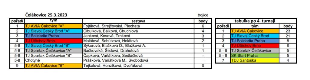 Vítězstvím stvrdit dominanci v poháru a zároveň dokončit pohárový triple (3. vítězství za sebou) chtěly jistě čakovické hráčky i na 4. turnaji zimního poháru žen pořádaného v Čelákovicích. Naopak Brod tušil, že chce-li ještě bojovat o celkové vítězství, má možnost jedinou. Dostat v turnaji Čakovice co nejvíce pod sebe. Případně v případě finálové bitvy zvítězit. Oproti předchozímu turnaji žádnou trojici nepostavil tým ze Střeleckého ostrova. Zato přibyly týmy Solidarity a Chotyně. Devíti členné startovní pole tak slibovalo hezkou porci zápasů pro všechny účastnice. Postupem času turnaj opět vygeneroval čtyři nejlepší týmy, kterými byly nestárnoucí Útěchov, v poháru se dobře prezentující Solidarita, Český Brod A a Čakovice A. Právě Solidarita komplikovala brodské plány výhrou prvního setu prvního semifinále. Zkušené hráčky ověnčené mnoha tituly poté však zkoncentrovaly hru a do finále proklouzly. Čakovice měly s Útěchovem trochu méně práce a tak pošetřily síly na finálové střetnutí. A právě Útěchov (Malátová, Schutzová, Holátová) se nakonec v bitvě o nepopulární bramboru musel sklonit také před Solidaritou (Janková, Kosová, Trnková), která brala přesvědčivou výhrou 2:0 bronz. Ve finále došlo na výše predikované předpoklady. Ostřílené trio brodských sestavené na vítězství (Cibulková, Chuchlová, Bálková) vědělo, že jedině výhra jim zajistí celkové vítězství v zimním poháru žen. Plechatá, Fojtíková a Strejčovská však byla proti a vítězstvím 2:0 stvrdila svou dominanci v letošním poháru a dala jasný signál soupeřkám do nadcházející sezóny.